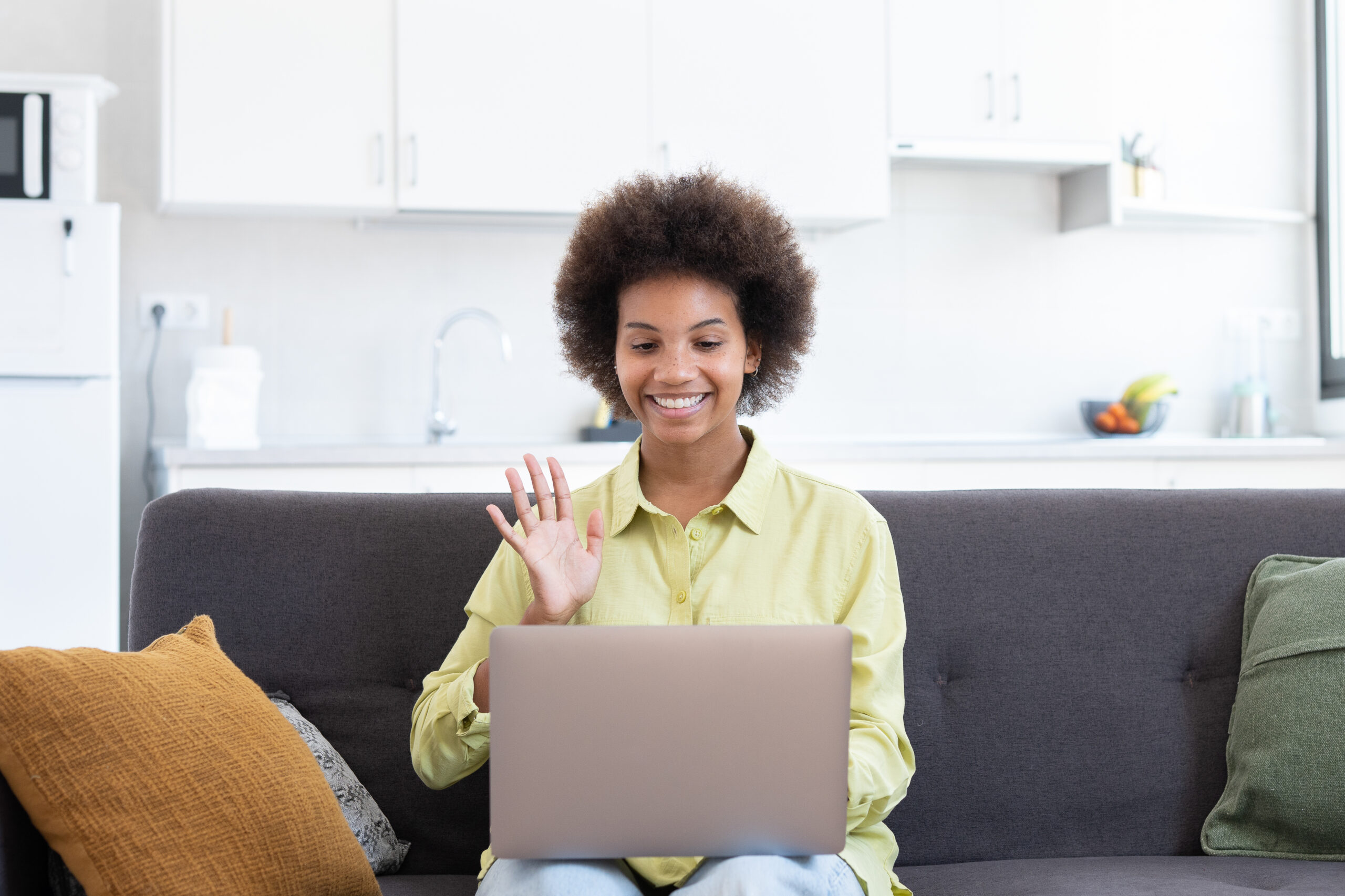 Easy learning. Smiling young mixed race lady sit on couch search
